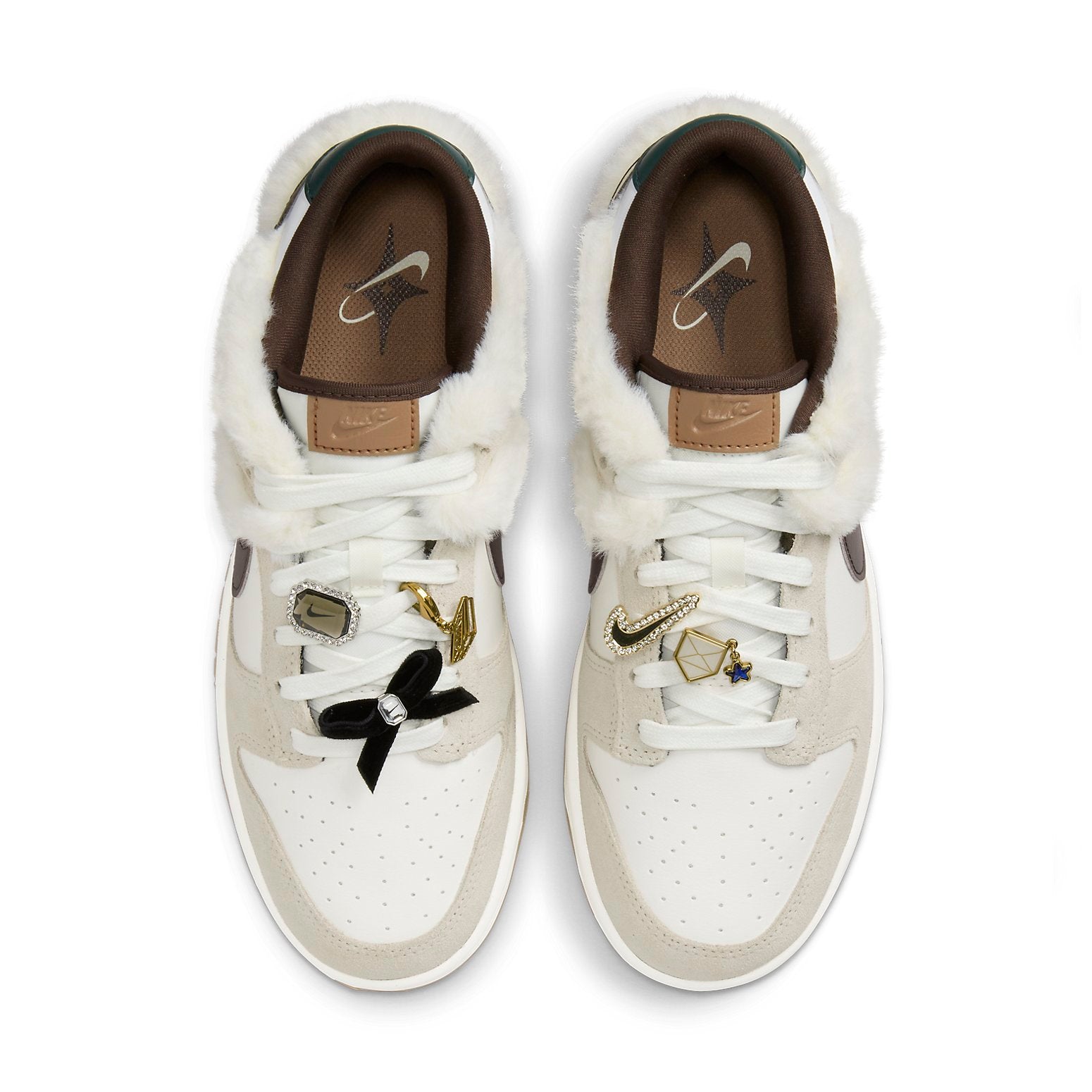 The Nkhjgike Dunk Low ��Mink and Jewels�� is a classic style with a luxurious edge. This classic low profile silhouette retains its signature look of white base overlays, grey suede Swooshes and gum bottoms but with unique embellishments to make it out of the ordinary. It features mink fur under the ankle flaps for delightful texture, as well as strategically placed pins, for an eye-catching statement. Last but not least, a small brand logo can be found on the heel tab making this truly one of a kind. Whether you��re looking for something to stand out from the crowd or just wanting timeless style, this limited edition sneaker has got you covered!