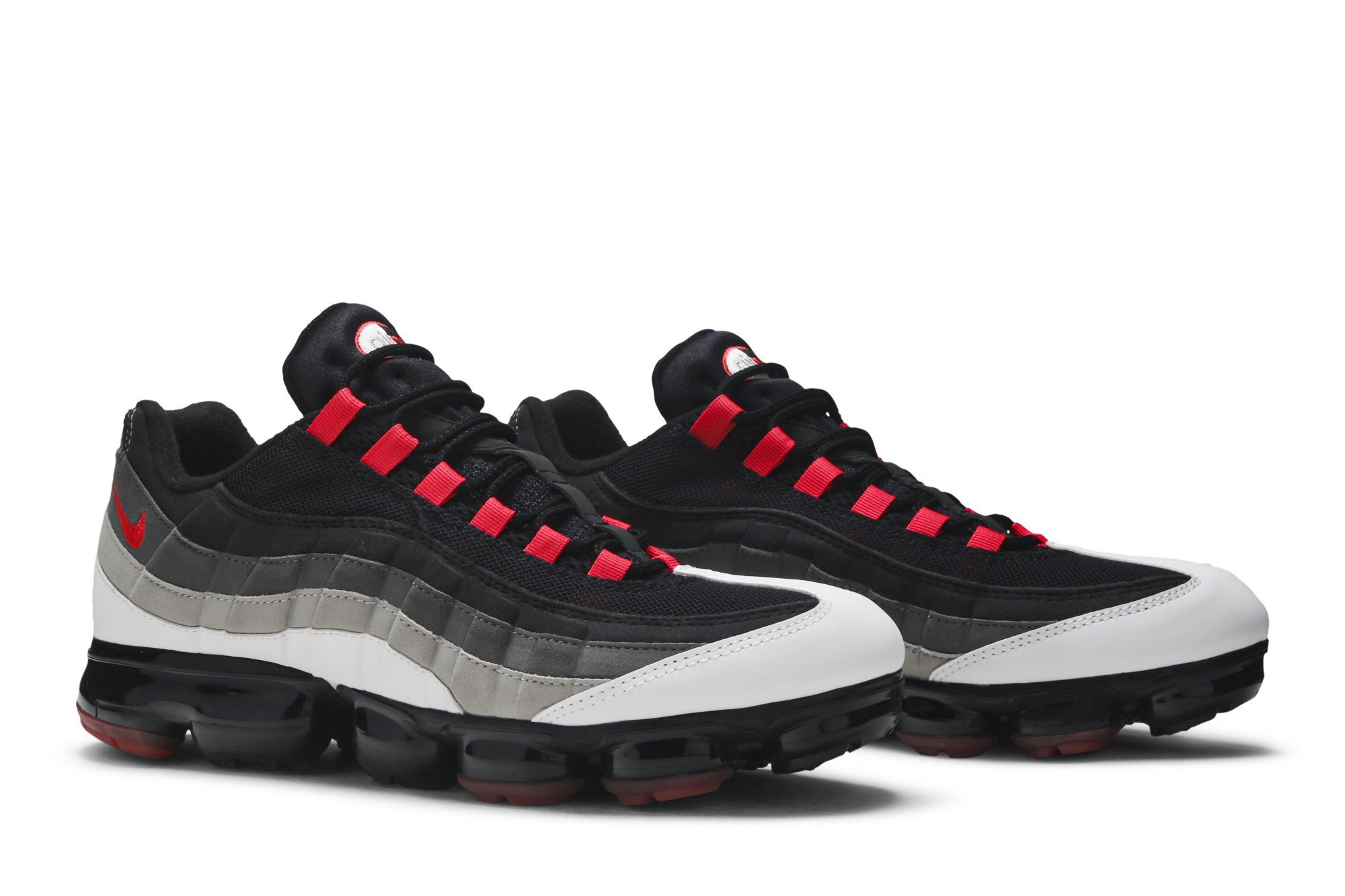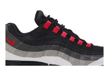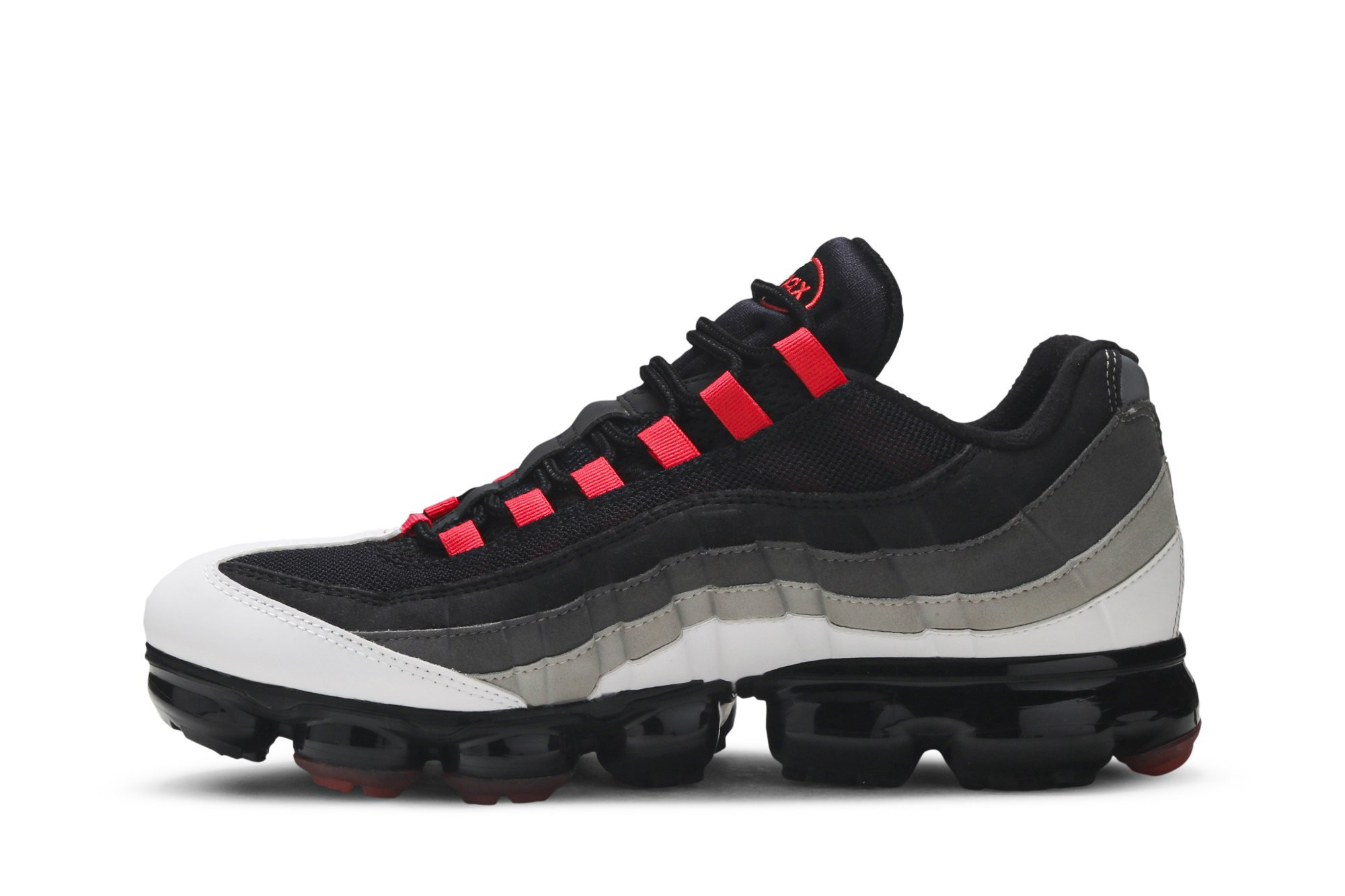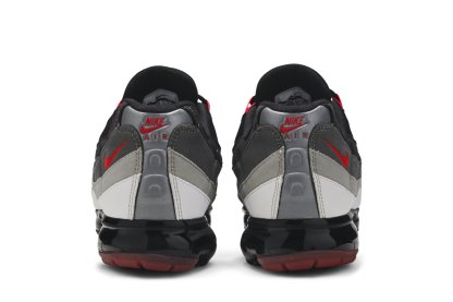 The Nkhjgike Air VaporMax 95 Hot Red features a gradated Hot Red, Dark Pewter, Granite and white colorway. Black laces fasten across a cushioned tongue accented with Air Max embroidery, while vibrant lace loops punctuate the eyestay. A red Swoosh and logo appear at the counter and reflective heel. The signature Air Unit has graduated into a full-length VaporMax bubble sole following a push to improve sustainability in 2018.